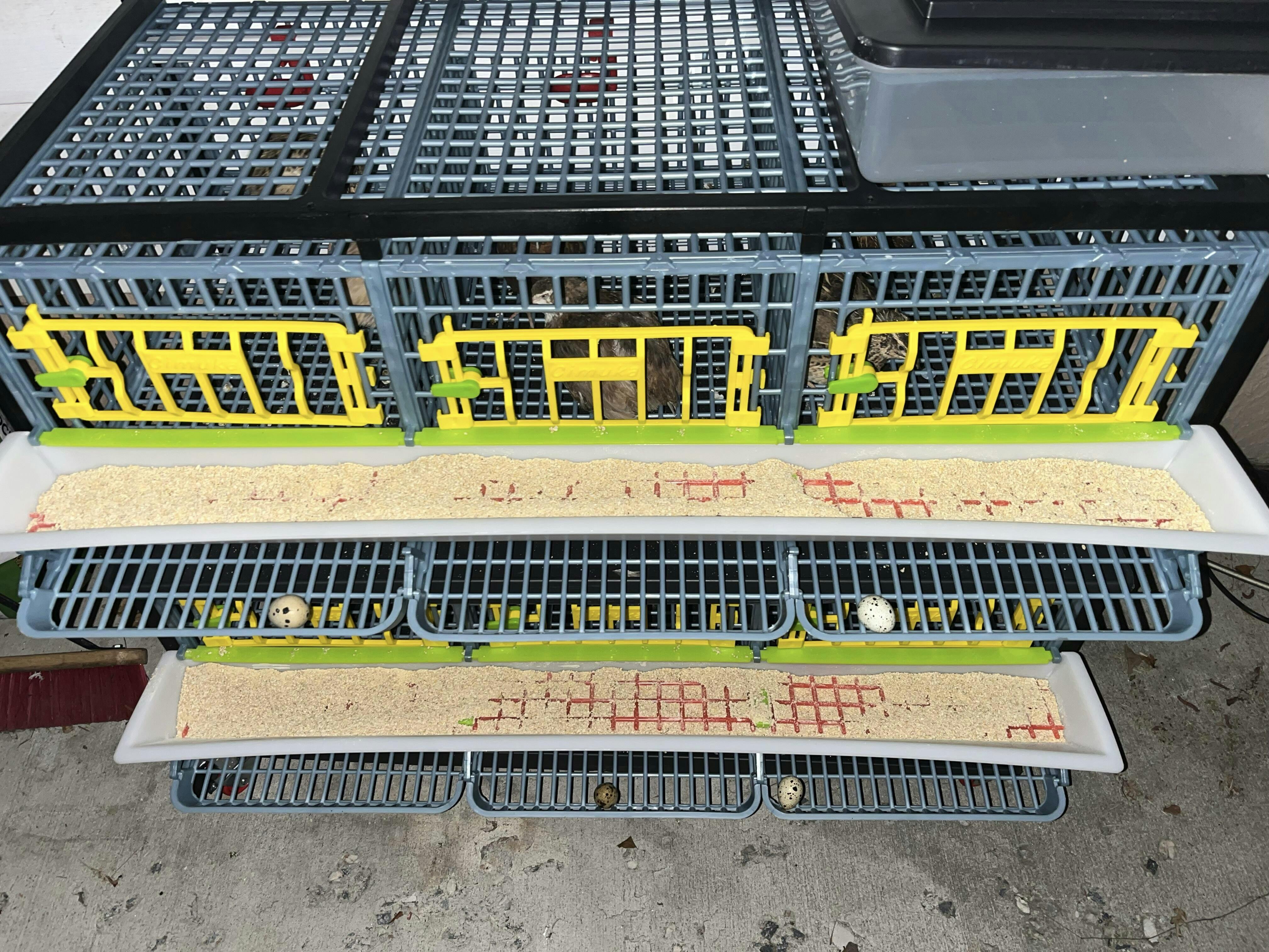 Ich liebe diese Wachtelzuchtkäfige. Eier sind leicht zu sammeln und bleiben sauber. Manchmal gibt es größere Kotballen, die nicht durch den Boden fallen. Füttern und Tränken ist einfach. Ich finde es auch toll, dass es jetzt offene Seitenwände für eine gemeinschaftlichere Haltung gibt (werde ich beim nächsten Set auch holen). Leicht zu reinigen und ziemlich stabil für Kunststoff. Ich wünschte nur, man könnte geschlossene Rückwände bekommen. Wir halten unsere Wachteln in der Garage und lassen oft die Türen offen für Luftzirkulation. Dadurch zieht es durch die Käfige also klemmen wir leere Futtersäcke hinten an. Außerdem wäre es schön, wenn die Kotwannen etwas länger wären, damit keine Kotballen die Eierschublade hinunterrollen.