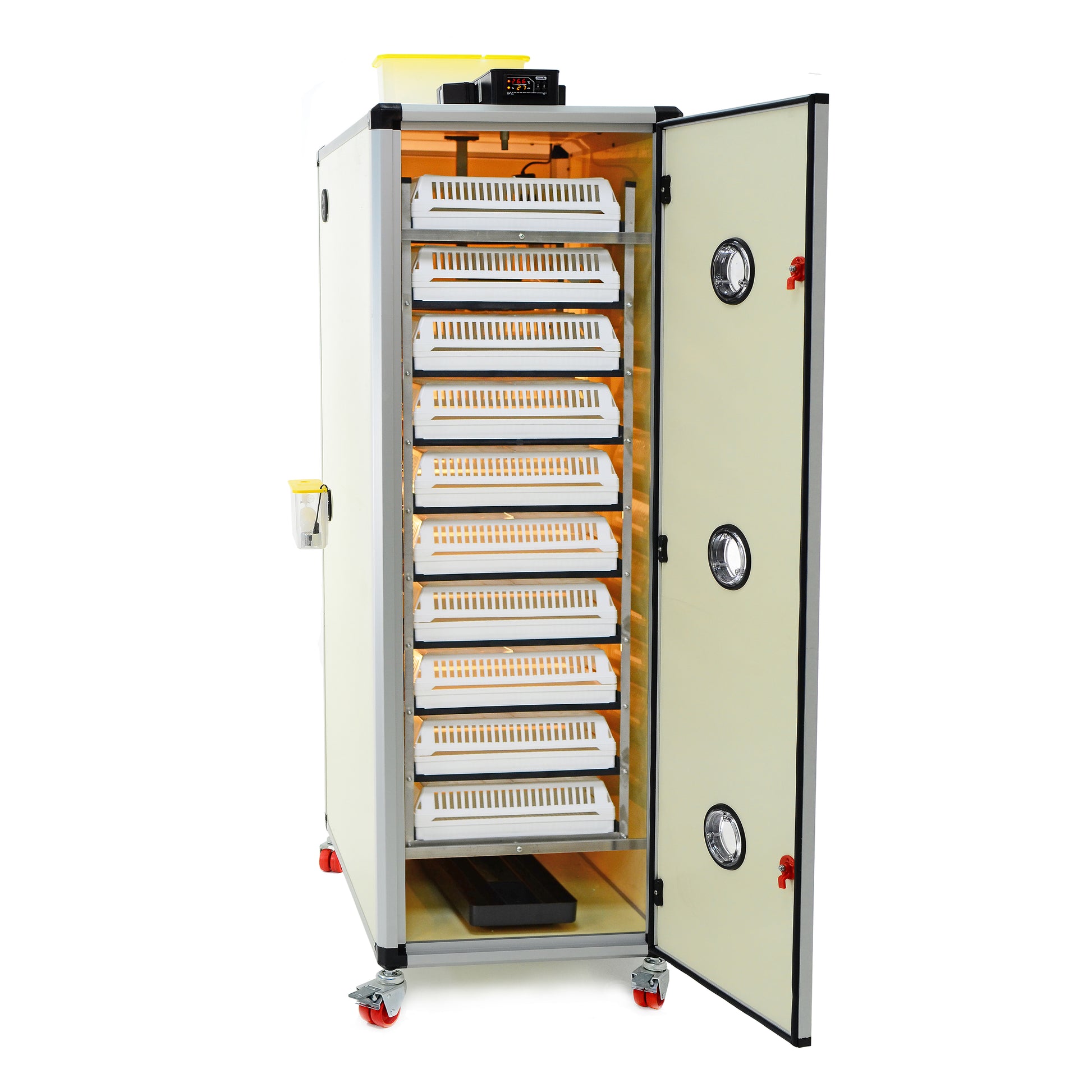 Einfache Reinigung und Wartung: Die doppelwandige, hochisolierte Kabine mit eloxierten Aluminiumecken und einer Tür auf der Vorder- und Rückseite ermöglicht eine einfache Reinigung und optimale Funktionalität sowie eine hygienische Umgebung für deine Küken.