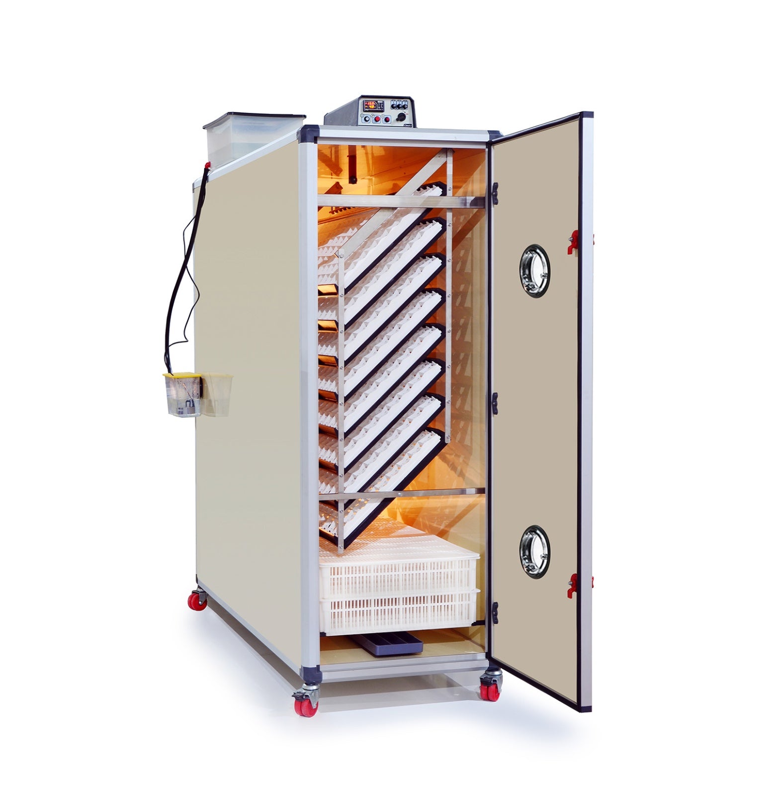 T2400-C: Maximale Effizienz für erfolgreiche Brut. Erlebe höchste Effizienz und Zuverlässigkeit mit der Cimuka T2400-C. Dieser vollautomatische Inkubator bietet eine ideale Kombination aus hoher Kapazität und herausragender Leistung für eine erfolgreiche Inkubation und das Schlüpfen deiner Eier. Mit 1920 Entwicklungsplätzen und 480 Schlupfplätzen ermöglicht die T2400-C eine flexible Nutzung. Dank energieeffizienter Technologie und umweltfreundlicher Materialien schont sie nicht nur deine Küken, sondern auch die Umwelt.