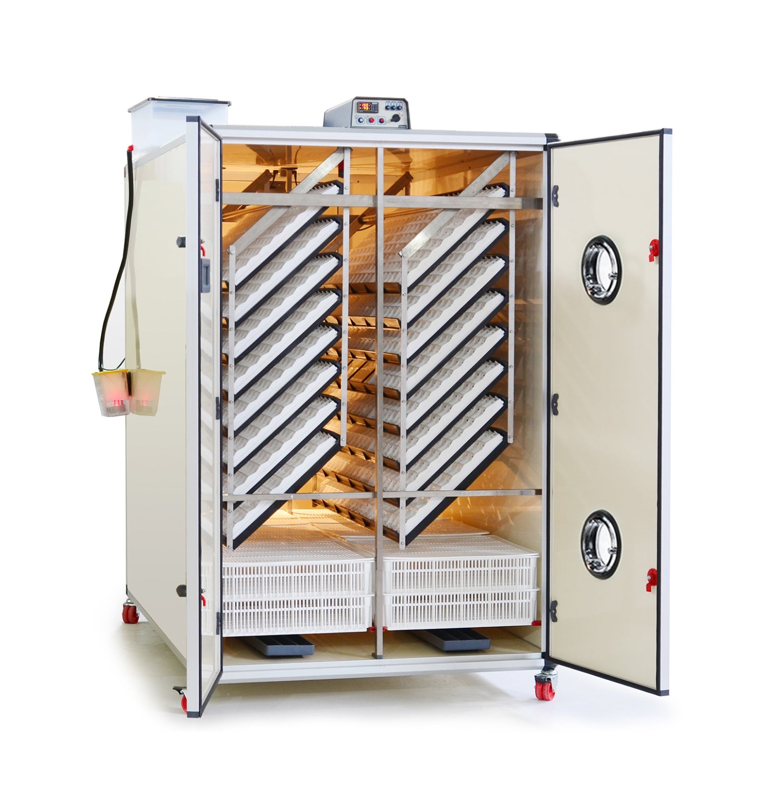 Einfache Reinigung und Wartung: Die doppelwandige, hochisolierte Kabine mit eloxierten Aluminiumecken und Türen an Vorder- und Rückseite ermöglicht eine unkomplizierte Reinigung, optimale Funktionalität und eine hygienische Umgebung für die Küken.
