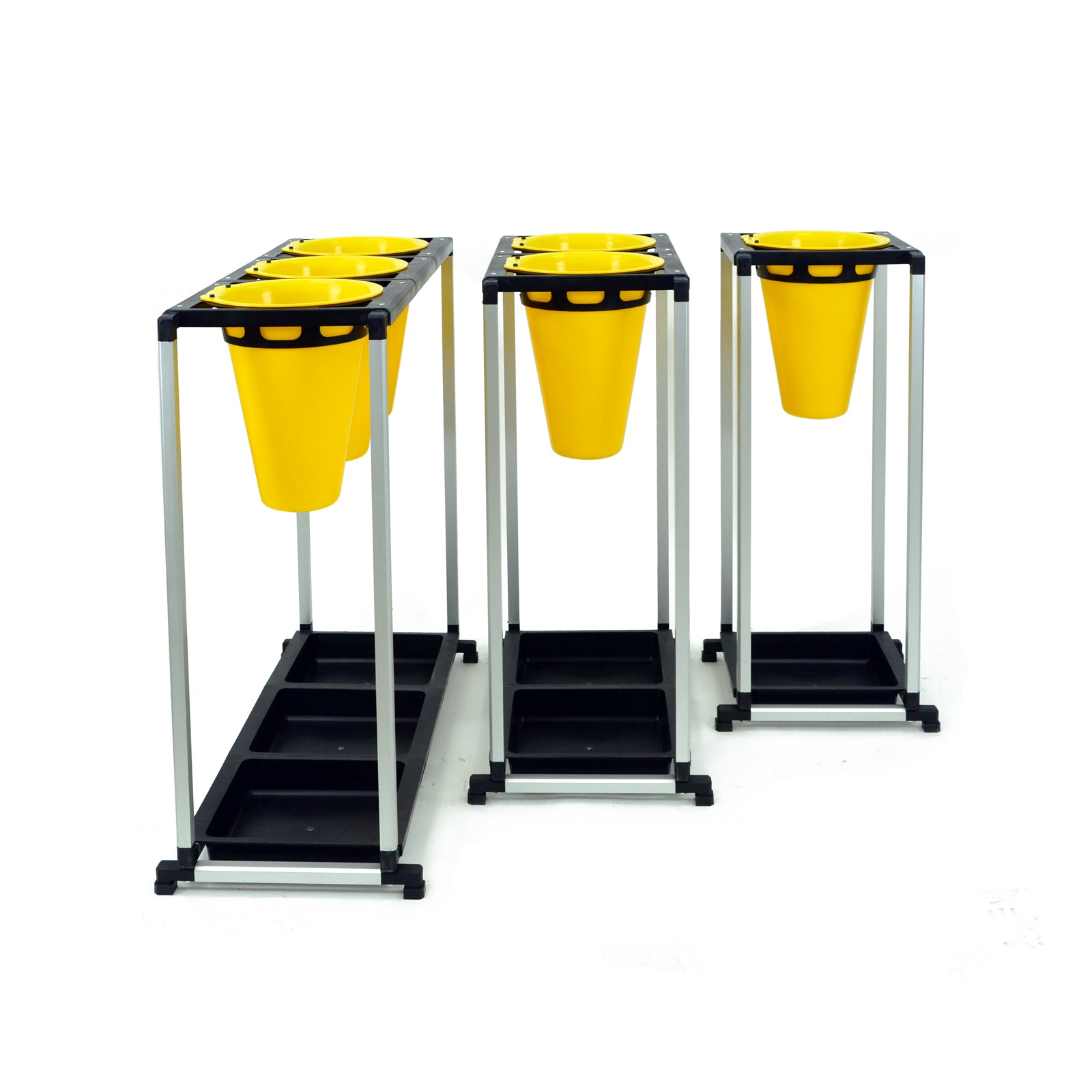 Der Stand besteht aus 2 Schlachttrichtern für Hühner, Befestigungsöffnungen für die Trichter, Blutauffangbehältern und einem eloxierten Aluminiumgestell.