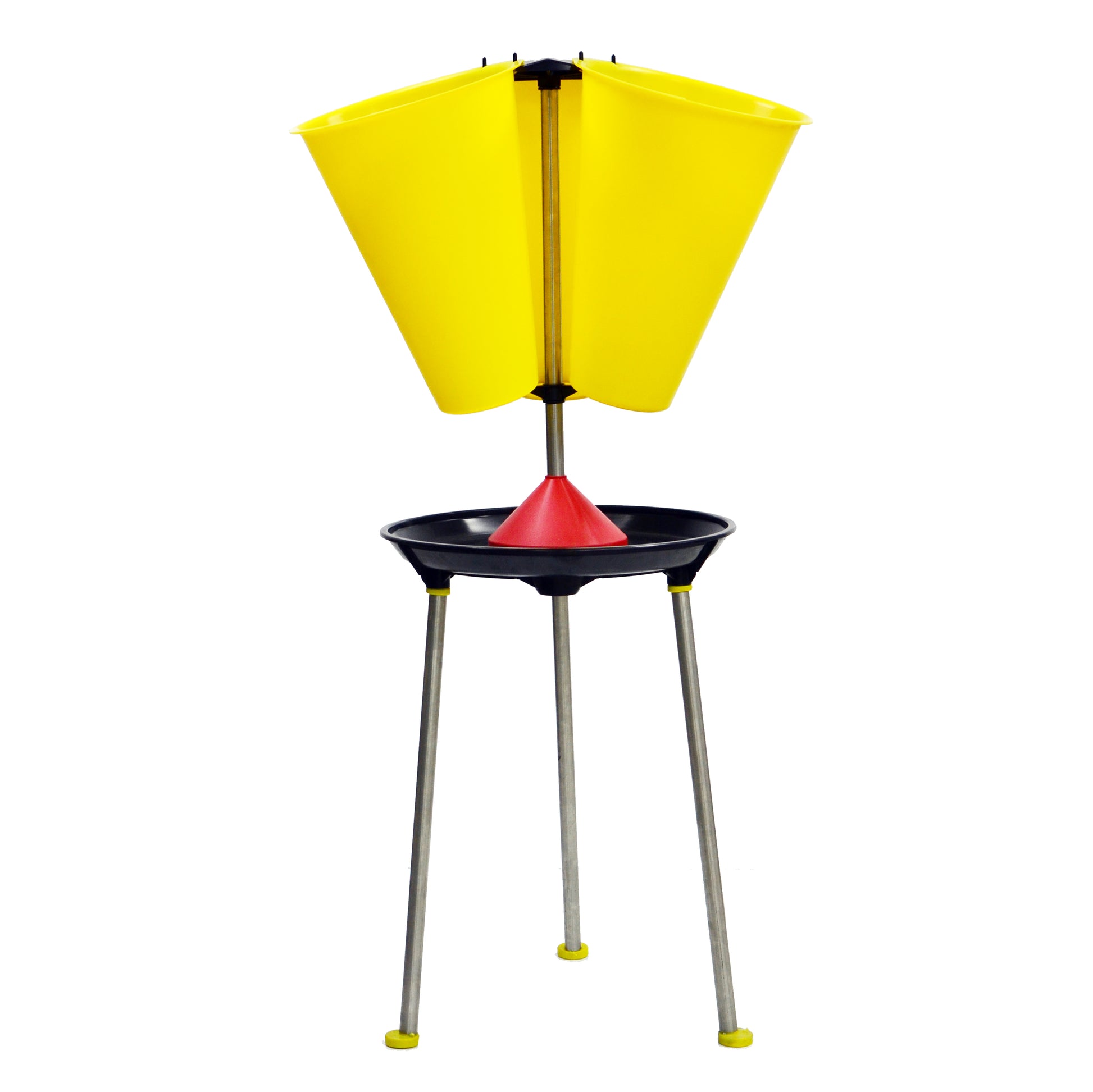 Der Stand besteht aus 5 Schlachttrichtern für Hühner, einer Platte zur Aufnahme der Trichter, einem Blutauffangbehälter, einem Kugeldrehmechanismus und 3 Standfüßen aus 65 cm Chromstahl.